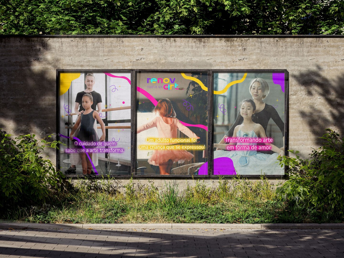 Exploramos o bordão já existente, forte e utilizado na marca que é "Transformando arte em forma de amor" já trazendo alguns posicionamento para a marca que é "O cuidado de quem sabe que a arte transforma", "O adulto funcional é a criança que um dia explorou, dançou, se expressou, sem medo."